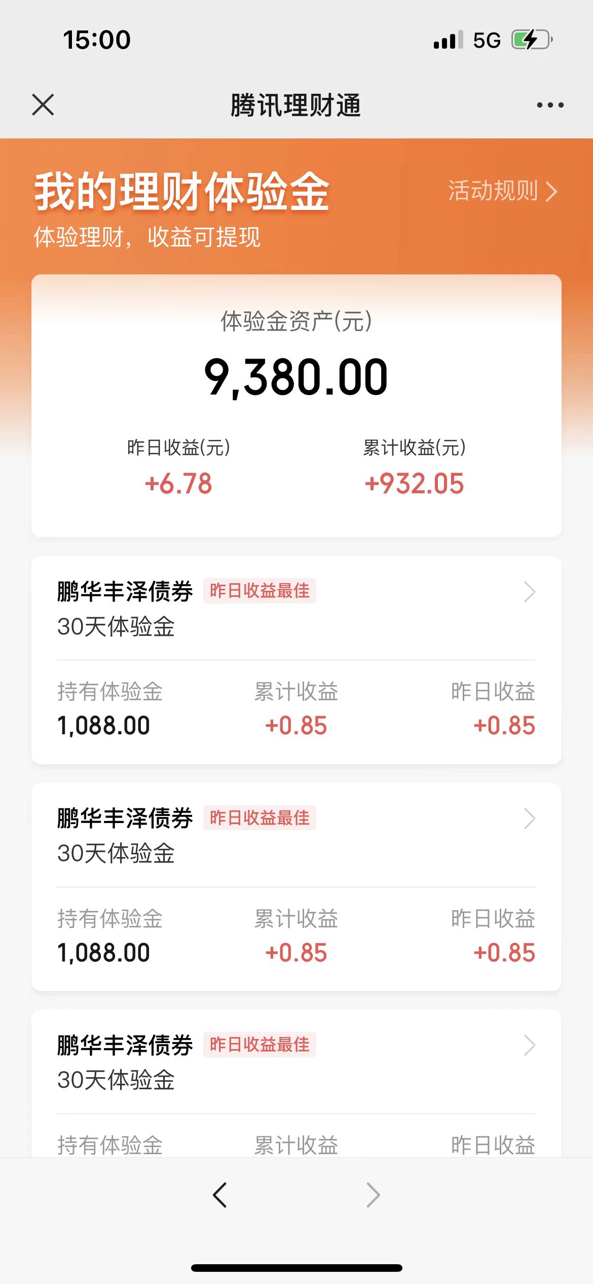 今天吃瓜群众看了一下自己前几天参加的微信基金体验金活动,也就是微信理财通基金体验金活动,目前一共到手了9380元基金体验金!