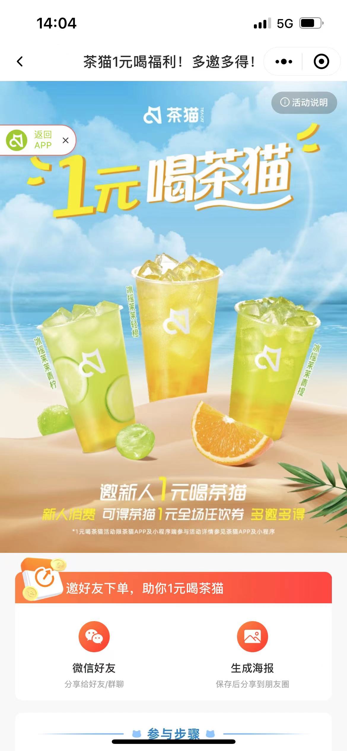 每邀请一个新用户点击邀请链接,注册并下单后,邀请人可以到手1张1元任饮券。新用户在茶猫小程序注册后可以获得1张1元任饮券。