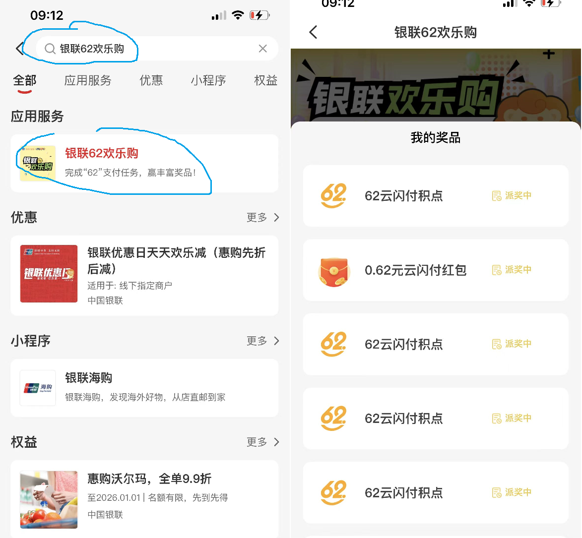 云闪付搜【银联62欢乐购】,上个月达标的,今晚11点前去抽奖。