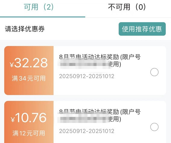 前几天,吃瓜群众收到了网上国网app送的电费满减券,大概价值40多元,后续在网上国网app充值的方式把这两张优惠券用掉了。