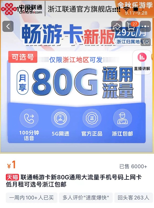 吃瓜群众当时是看了当时有人发的帖子说淘宝上的浙江联通官方旗舰店有不错的大流量套餐。29元80G流量,不过仅限浙江地区可发。