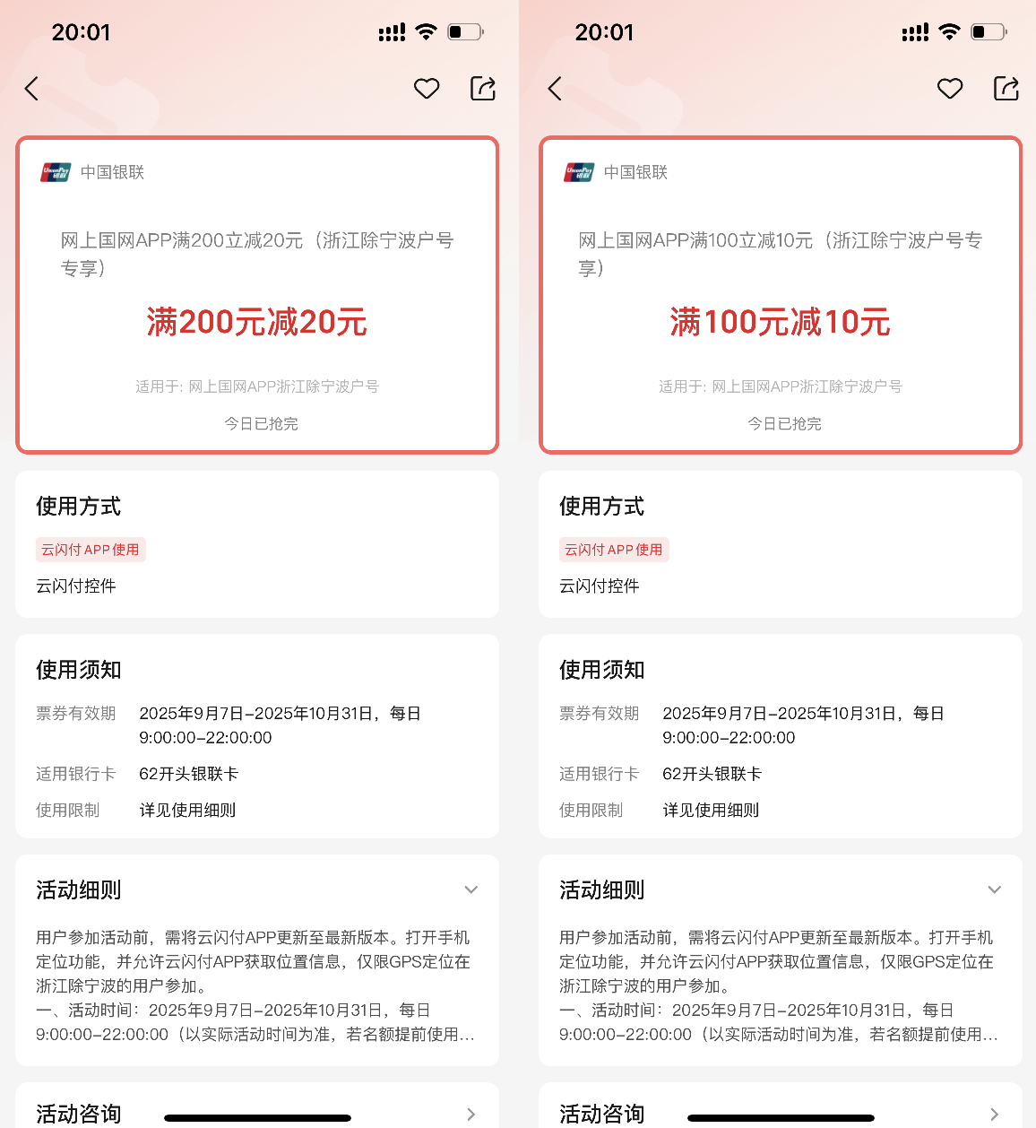 饿了么红包 每天可领 截止2032年4月14日 这个电费优惠吃瓜群众还没有参加,这个活动名额不多,最好设个闹钟,提前准备,免得错过了。每天9点准时开抢,提前准备,单用户单活动限享受1次。 活动活动截止10月31日。 在网上国网app,充值200元,选择云闪付付款,一定要看到满200-20的字样,再选择付款。选择参加满100-10活动的,可以考虑选择充值100元。 完整的活动细则,可以在云闪付app-搜【网上国网】-点击对应活动查看相关细则 中秋国庆大促综合会场 白酒、月饼礼盒、乳品、日百优惠爆品 微信扫码 关注我们 注:本文包含广告内容,请自行判断 未经允许不得转载:51优惠活动 » 2025年9-10月浙江除宁波电费优惠200-20和100-10