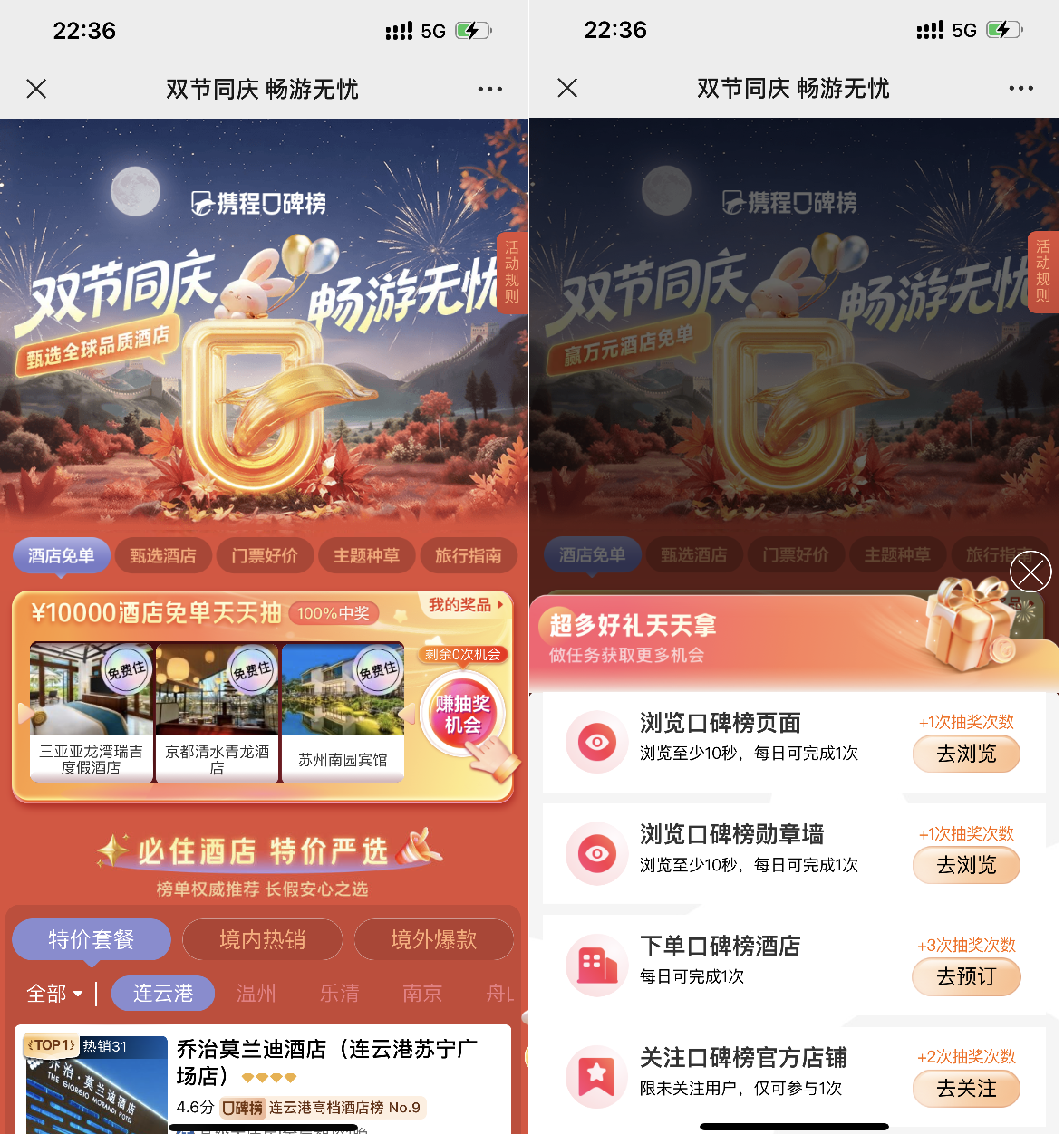 携程10000酒店免房券天天抽,今明两天每天可抽