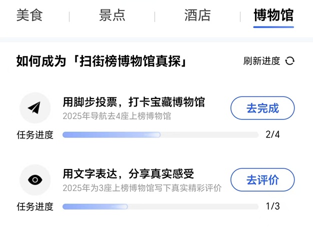 吃瓜群众抽了一个下午去完成这个任务,考虑到上榜的博物馆只需要导航4家,写3个评价就可以,吃瓜群众选择的是博物馆。