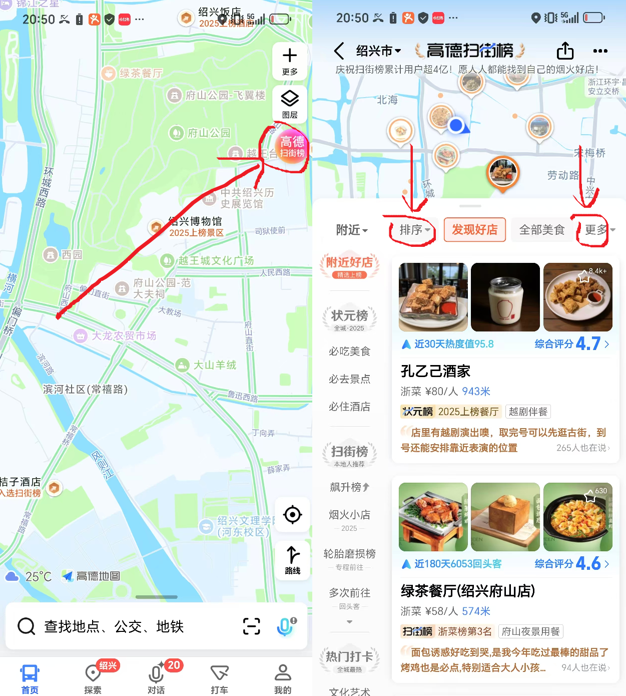 在高德地图首页点击【高德扫街榜】-进入扫街榜后,点击【更多】可以选择分类比如【美食】【景点】【酒店】【博物馆】,然后可以点击【排序】比如按距离排序