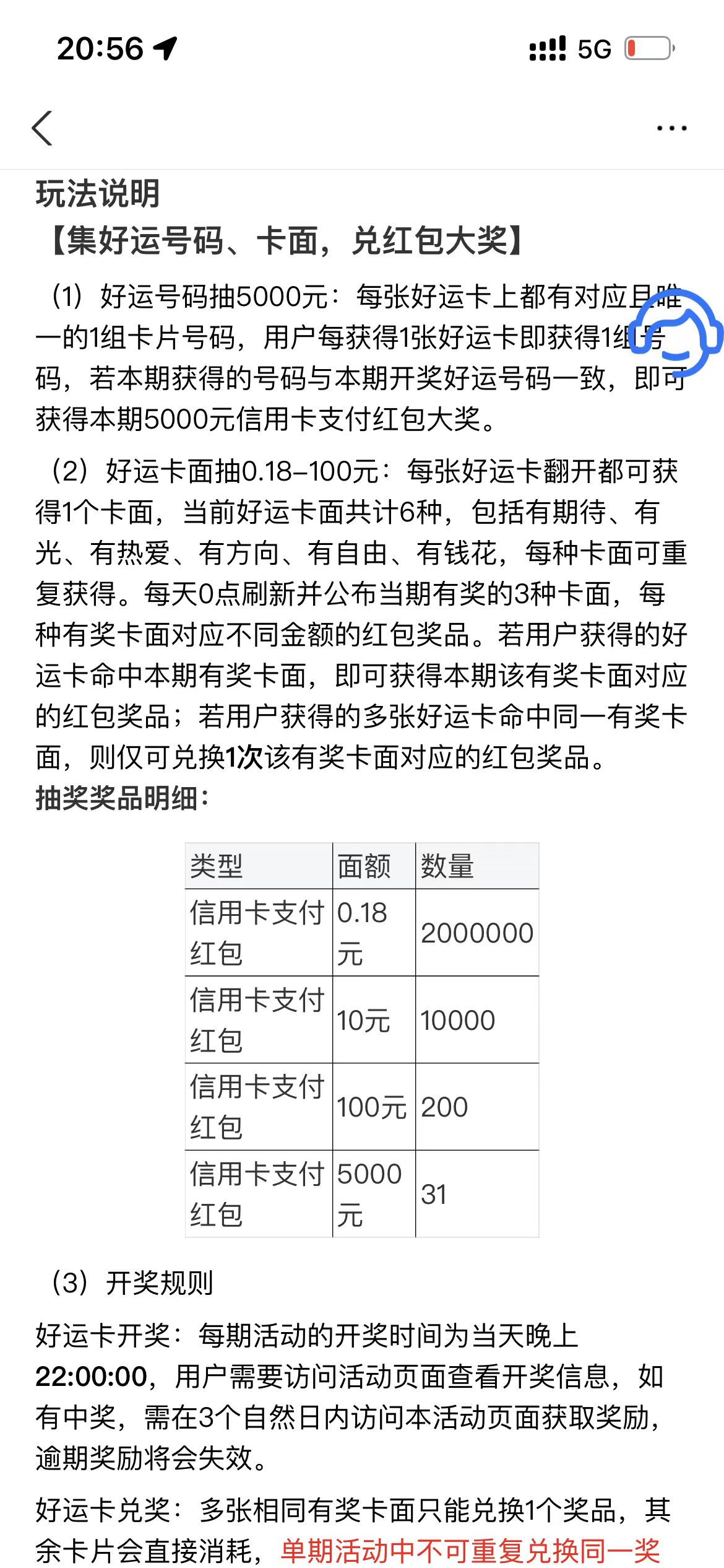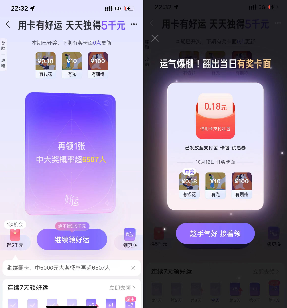 每晚10点开奖,奖品分别是0.18元,10元,100元信用卡支付宝红包。需回到活动页面查看中奖情况。