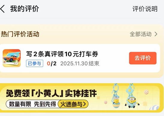一天写2个评价,通过活动审核后就可以领取10元满减打车券了,当天完成任务当天就要领取(逾期不能领取),活动期间每天可参与活动。