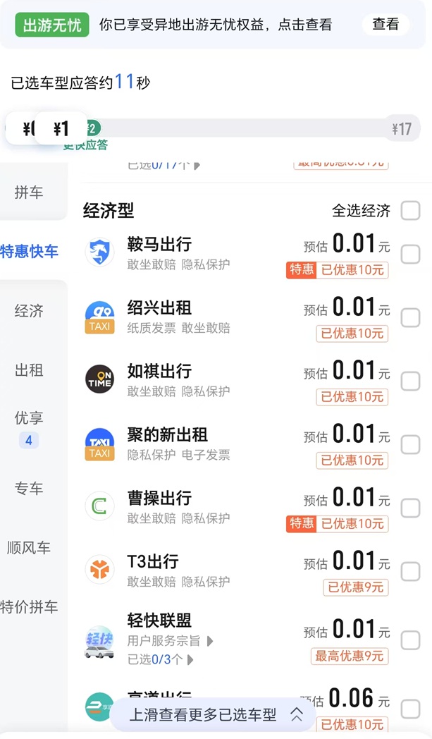 吃瓜群众参与活动领到券后,在打车页面直接显示优惠后预估0.01元。
