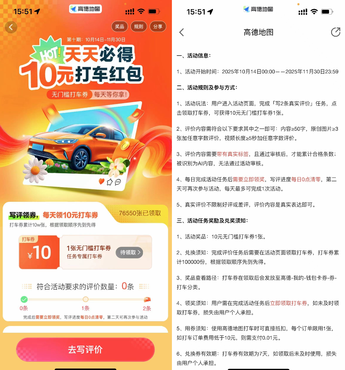 吃瓜群众自己的经验,当天写2个评价,带上至少3张图片+至少50个字数,评价的地方都是吃瓜群众之前导航过的地点,比如家门口的超市啊之类的。活动页面显示审核通过后就领取10元无门槛打车券了。