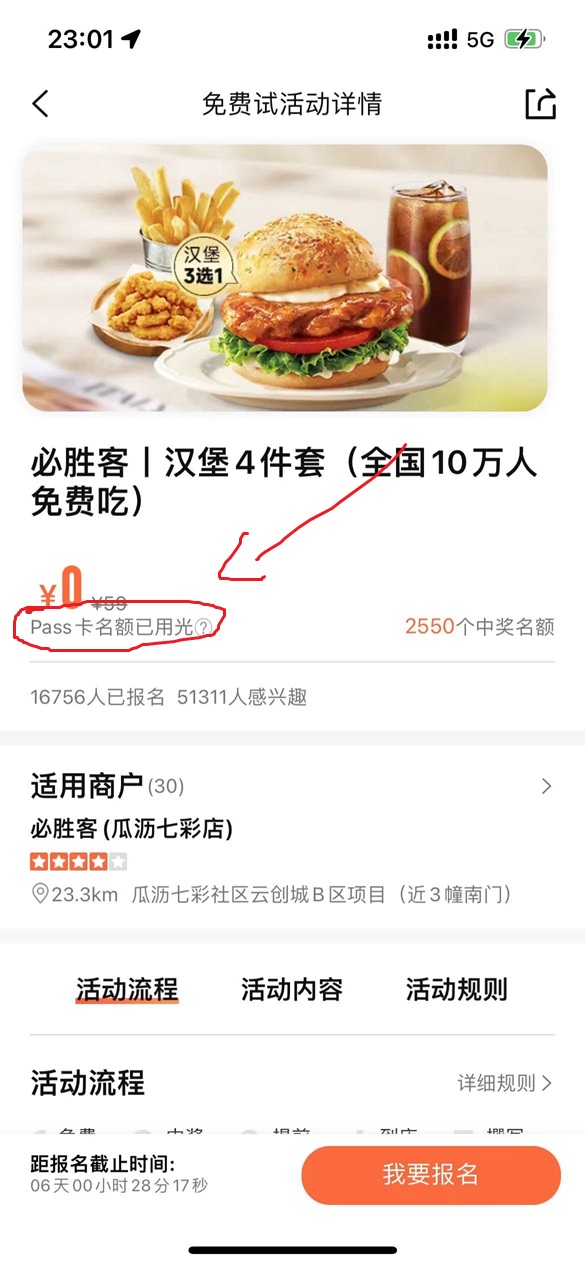 本来吃瓜群众准备用大众点评的霸气币兑换个美食pass卡,报名的时候用美食pass这样就可以保证100%必中,可惜活动页面显示【pass卡名额已用光】,那只能靠运气抽奖了,方便的话,个人觉得可以告诉家里人这个活动,大家一起参与。