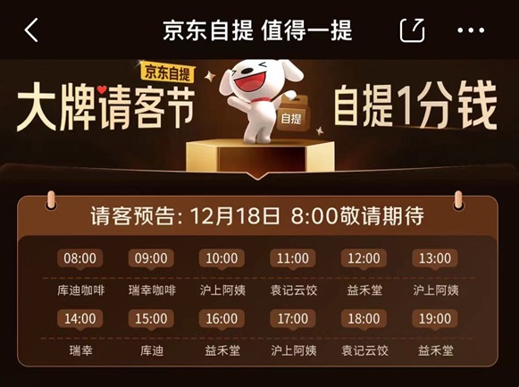 京东大牌请客节,12月18日1分钱整点抢。 从12月18日早上8点开始,每个整点有不同品牌可以1分钱抢,一直到12月18日晚上7点。 根据吃瓜群众经验,个人猜测12月18日早上8点的库迪咖啡估计是最好抢的。只是个人猜测,不保证一定是这样的。 微信扫码 直达活动入口 微信扫码 关注我们 支付宝红包活动,活动期间每天可领支付宝红包,两个红包活动不冲突,每天各领一次。昨天领过的,今天还可以领。 微信扫码 关注我们 注:本文包含广告内容,请自行判断 未经允许不得转载:51优惠活动 » 京东大牌请客节,12月18日1分钱整点抢
