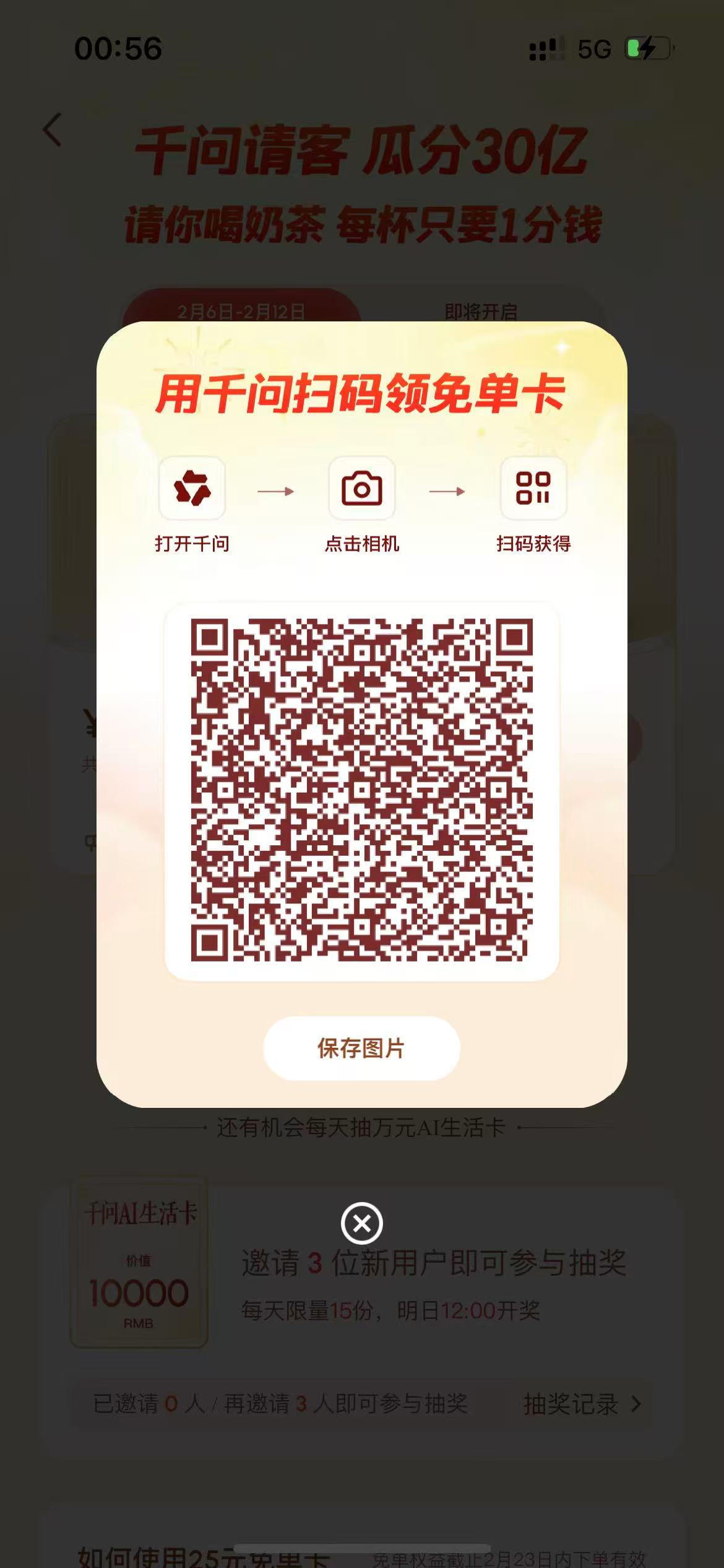未经允许不得转载:羊毛头子说羊毛 » 亲测!千问30亿红包怎么领取参加?真的是1分钱点了一杯奶茶!到手千问免单卡!