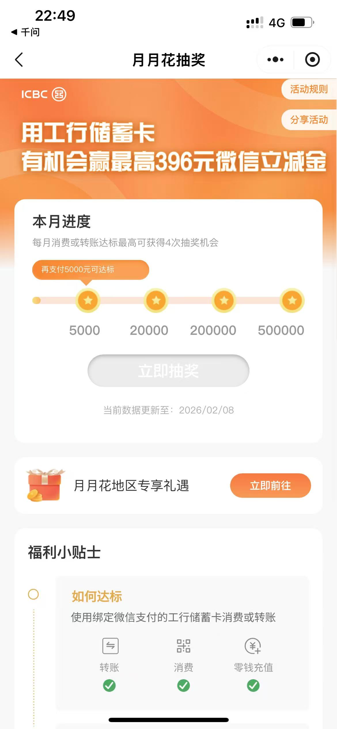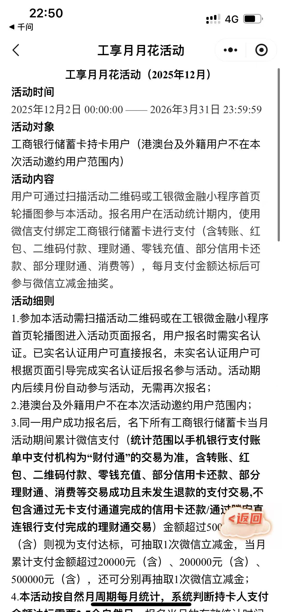 用户可通过扫描活动二维码或工银微金融小程序首页轮播图参与本活动。报名用户在活动统计期内,使用微信支付绑定工商银行储蓄卡进行支付(含转账、红包、二维码付款、理财通、零钱充值、部分信用卡还款、部分理财通、消费等),每月支付金额达标后可参与微信立减金抽奖。