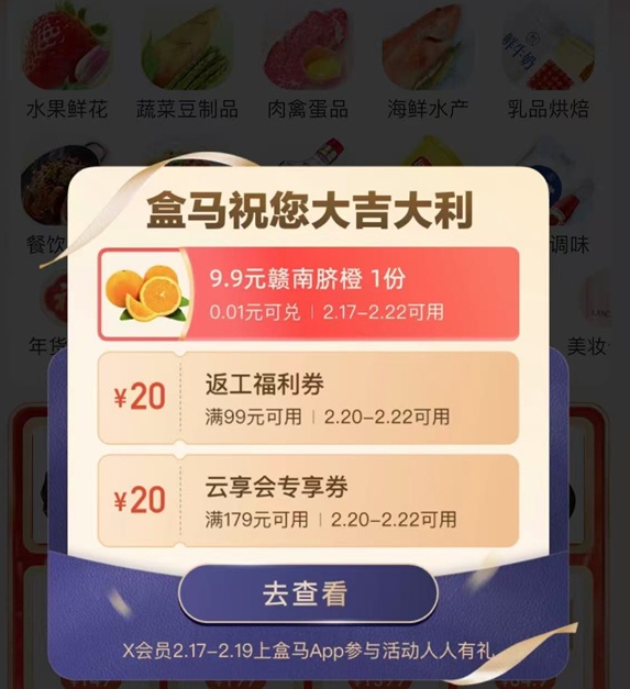 吃瓜群众是盒马的钻石会员,昨晚试了一下,打开盒马app没有弹出领券的页面,今天更新了一下盒马app,再次打开就领到了一张【0.01元买赣南脐橙 1份】。
