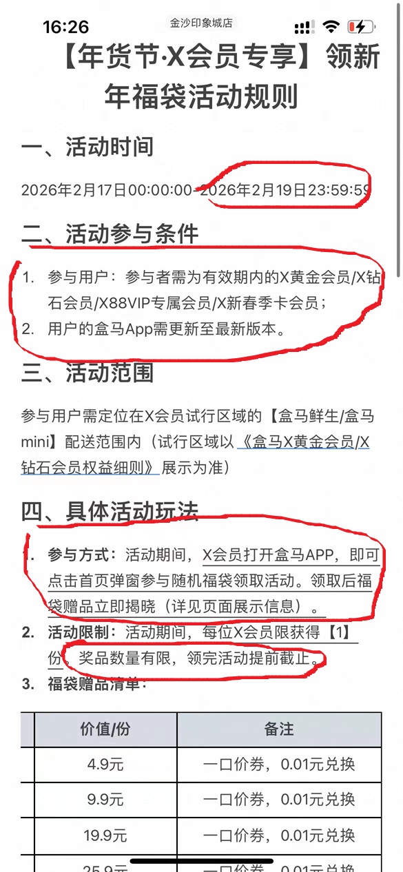 提醒一句,这个活动限制部分盒马用户参与(有效期内的X黄金会员/X钻石会员/X88vip会员/X新春季卡会员),重点是需要更新盒马app最新版本,这个别忘了。