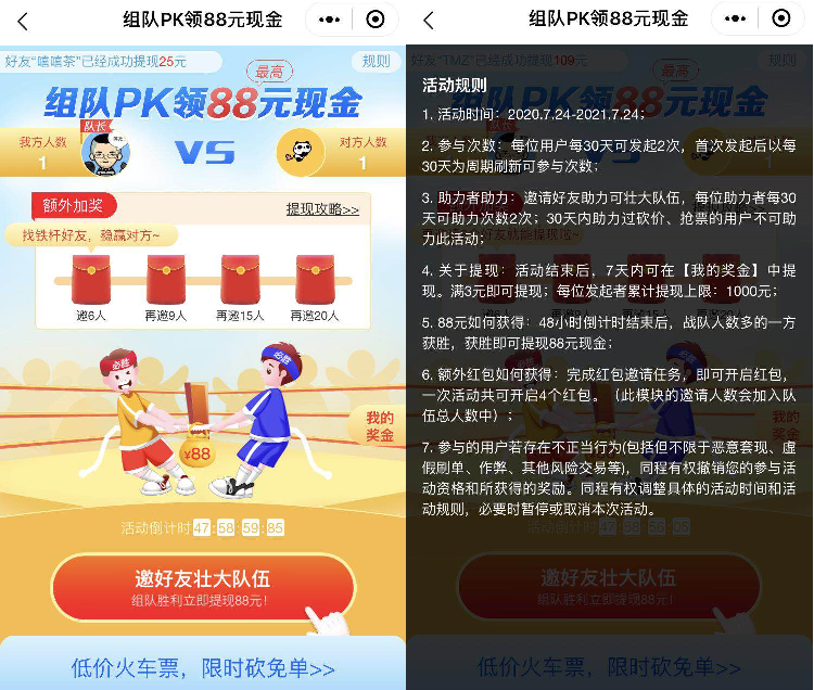 未经允许不得转载:51优惠活动 » 同程组队PK领88元现金,组队人数达标可获得现金奖励!