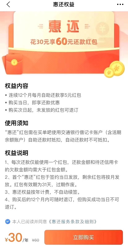 买单吧app –搜【惠还】,30块钱买60元的还款红包,分为12个月使用,每个月使用5元。在买单吧使用交行借记卡自助还款时抵扣。