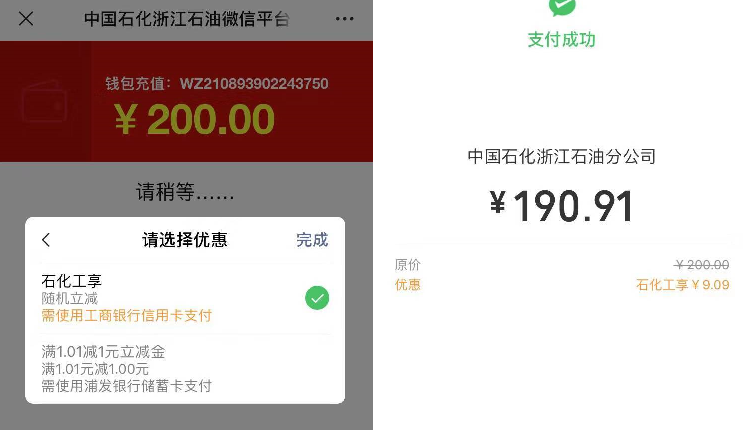 吃瓜群众是通过‘中国石化销售股份浙江石油分公司’公众号-易捷钱包充值参与活动的。参与的时候,选择微信支付工商银行信用卡或者储蓄卡即可,有优惠名额的话会显示随机立减。