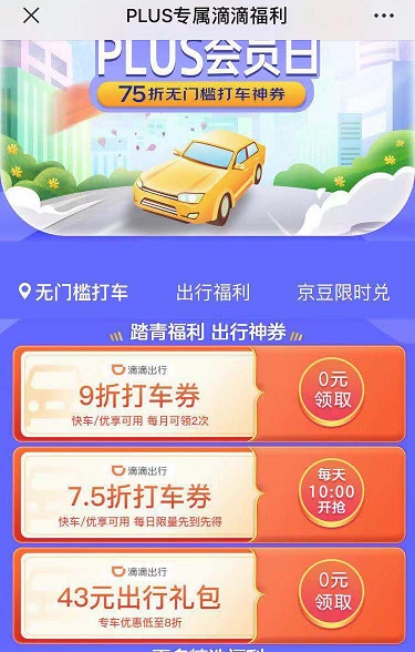 再说一下,京东PLUS会员免费领滴滴7.5折打车券活动,早上10点领取,活动结束时间不详,每人可领取一次!